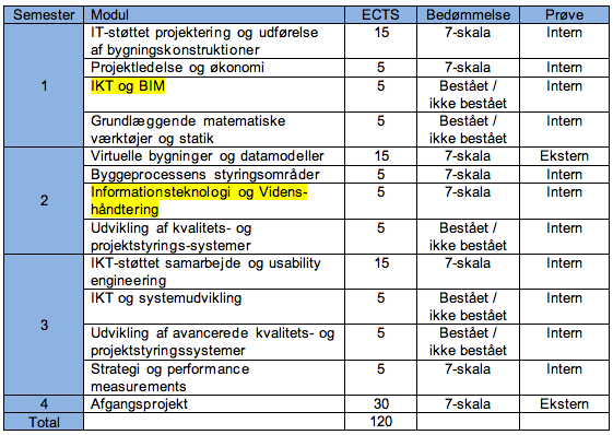 Dette kursus på semester 2 erstatter semester 2 kursus fra den gamle studieordning "Videnrepræsentationer i byggeprocessen" og er sammensætning af semester 1 kursus "IKT og Bygningsinformationsmodellering" (der PPM kursus, 2 ECTS, fra gamle Studieordning ingår) og semester 2 kursus "Informationsteknologi og Videnshåndtering" fra den nye Studieordning.