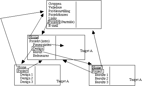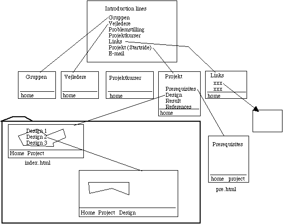 - Create the four web pages according to the figure. Use a HTML editor or a any text editor. Download for example DominHTML3.5 from http://sunsite.auc.dk/tucows/adnload/dldfree.html.