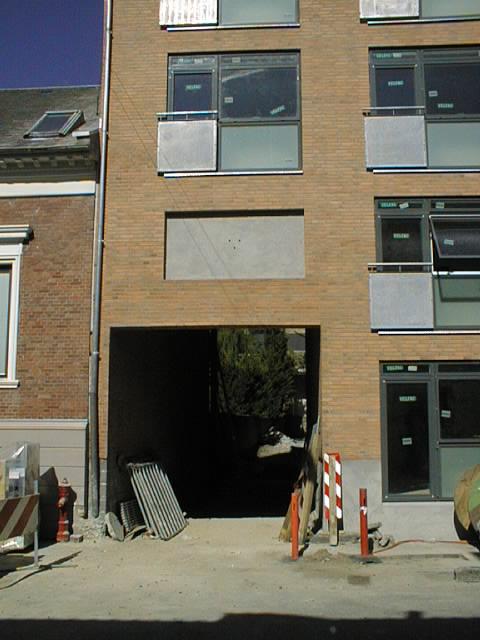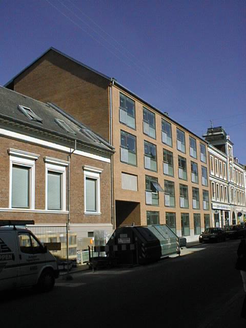 Bygning A set fra facaden. Det sorte firkantede hul på billedet er gennemkørslen til bygning B. Billedet er taget mod syd-vest.