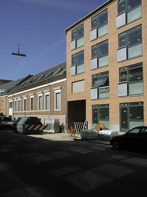 Den røde bygning bag byggecontaineren er ungdomsboligernes bygning A i Jernbanegade i Aalborg. Billedet er taget mod nord.