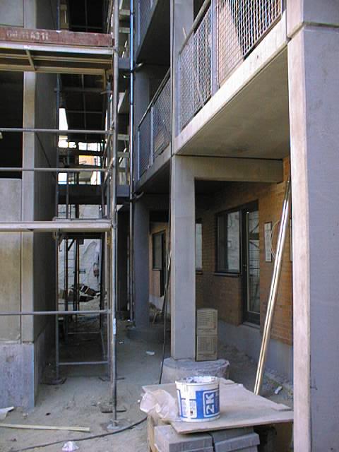 Billedet illustrerer den snævre plads der er i gården mellem bygning A og B. Det er her specielt afstanden mellem altangangen på bygning A og trappetårnet i midten af gården der er i fokus. Billedet er taget mod nord-øst.