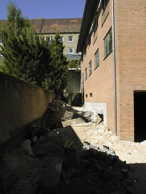 Billedet her er taget mod vest langs den sydlige facade af bygning B. På det lille felt mellem bygningen og muren skal der senere sås græs. Det ses endvidere på billedet at muren til venstre er så høj, at det ikke har været nødvendigt for Skanska at indhegne grunden andre steder end ud mod Jernbanegade.