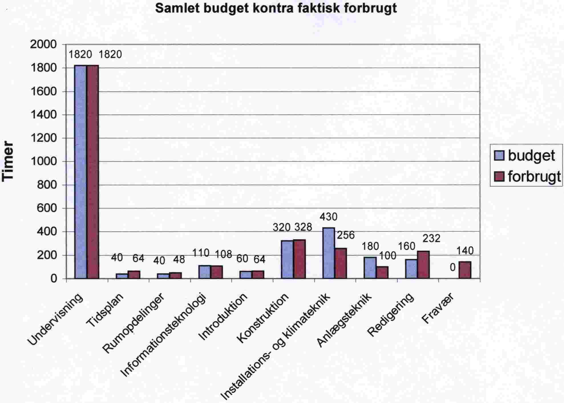 Ud fra gruppens interesse er der udarbejdet en tidsplan over projektperioden, hvoraf resultatet vises på denne side. Tidsplanen blev opbygget i 8 dele, hvor de 5 første er hver enkelt gruppemedlems oversigt og de sidste 3 dele er opdelt i budget, forbrugt og opgørelse. "Budgettet" viser hvordan gruppen regner med at anvende projektperioden, og "forbrugt" er det aktuelle forbrug af projekttid. Opgørelsen illustrerer budget kontra forbrugt, hvor der er optegnet et søjlediagram og et cirkeldiagram. Som det fremgår af opgørelsen er der brugt meget projekttid indenfor området konstruktion, som er et resultat af, at konstruktionsdelen blev grebet forkert an i starten. Punktet fravær er på 4 %, der anses for at være for højt. Den for gruppearbejdet høje fraværsprocent er opstået ved en kombination af ferie og sygdomsperioder. Fordelen ved tidsplanen er, at den har virket som en motivationsfaktor i gruppen, hvor ulempen er at alle de interessetimer som er anvendt ikke er påført.