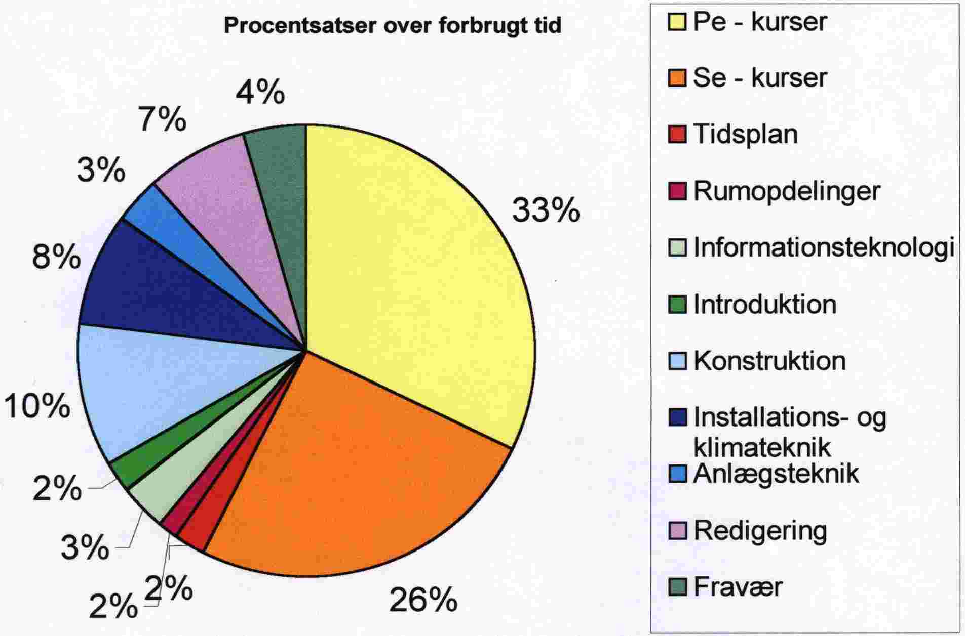 Søjlediagrammet herover viser gruppe C-128's budget over tidsforbruget og den forbrugte tid. Søjlediagrammet bruges til opstilling af nedenstående lagkagediagram, der illustrerer det samlede tidsforbrug over semesteret.
