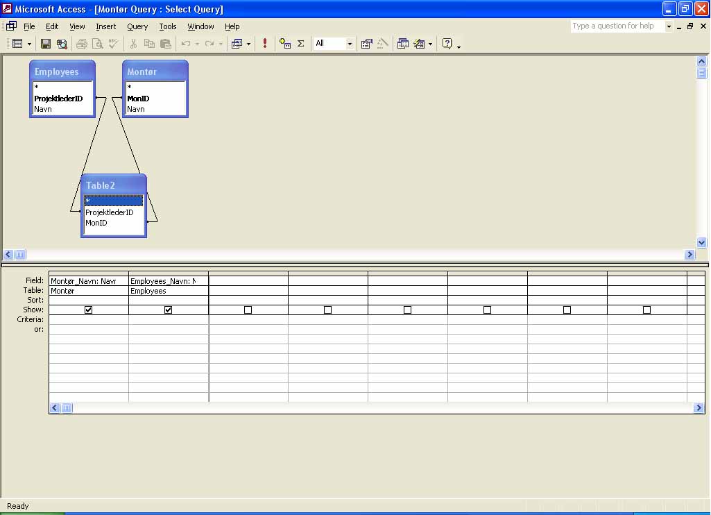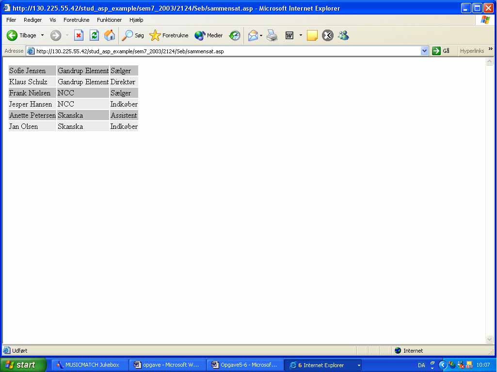 Exercise D on database design and web access[goto top]GROUP 2.121Access kan bruges til at lave databaser hvor man så kan ”hive” de relevante oplysninger ud af databasen. Dette gøres ved at anvende forespørgelser. Access kan bruges til at skabe overblik over store mængder af data. På forskellige byggerprojekter kan Access bruges til at sikre, alle byggeriets parter på den pågældende byggesag, adgang til alle relevante dataer. Vedr. brugen af en fælles database imellem f.eks. CCCo og deres leverandører, kunne databasen bruges til at udveksle oplysninger, f.eks. kunne CCCo gå ind og se om en af deres leverandører havde en speciel komponent på lager. Et andet eksempel på anvendelse er, brugen af Access til at skabe overblik over firmaets ansatte. Da firmaet arbejder i projekter, kunne entrepiselederen bruge Access til at sikre sig overblik over hans projketledere og deres behov for diverse montørsjak.