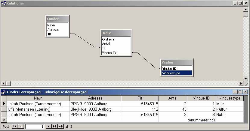 GROUP 2.122Brug af databaser i projektetI projektet kan databaser bruges til at sammensætte forskellige tabeloplysninger, i det omfang der er brug for de forskellige oplysninger. Virksomheden har i dag allerede et fungerende system, hvori skabeloner for vinduestyper er prædefinerede. Disse kaldes af sælgerne ved udarbejdelse af tilbud, og tilpasser herefter mål mm. til den aktuelle ordre. Dette system benyttes også som kundekartotek, hvori oplysninger om tidligere ordrer, nuværende ordrer og andre relevante oplysninger om kunden. Dvs. at systemet også bruges som vidensdelingsdatabase mellem medarbejderne i salgsafdelingen. Systemet kan f.eks. videreudvikles således, at oprettede kunder selv kan indtaste ordrer via Internettet ved brug af adgangskoder, og herved opnå en besparelse ved selvbetjening. Her skal det være mulige, for de forskellige kunder, at finde oplysninger om tidligere ordrer, og evt. genbruge oplysninger herfra eller arbejde ud fra de tidligere nævnte skabeloner. På figuren ses databasen, der opbygget i MS Access. Det øverste af figuren viser, hvorledes relationerne er mellem de enkelte tabeller, mens det nederste af figuren viser en forespørgsel.
