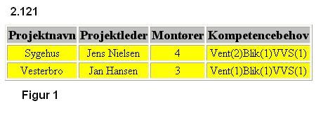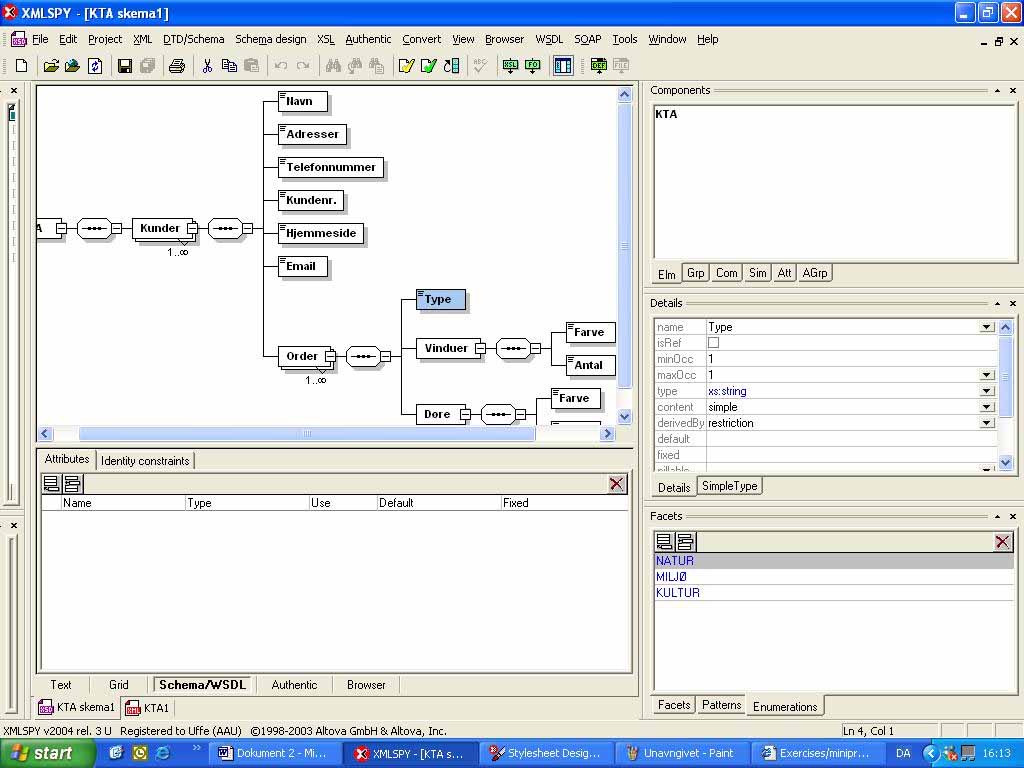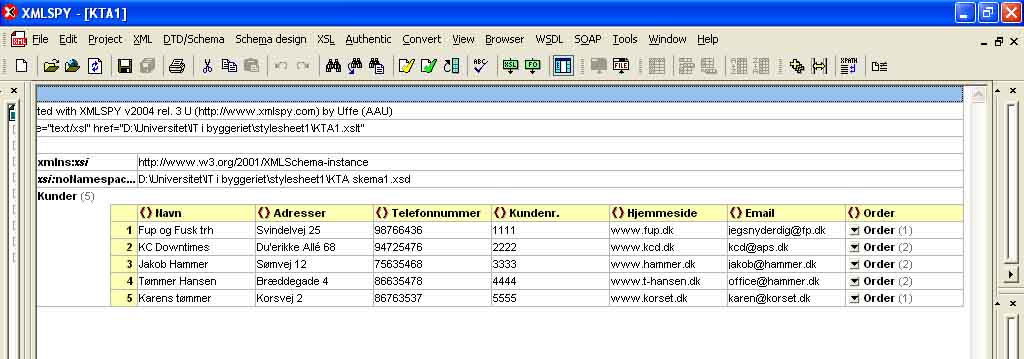 Exercise E on meta structuring of information using XML and RDF[goto top]GROUP 2.121På de nedenstående figurer ses resultatet af brugen af XMLSPY og derefter Stylesheet Designer. I XMLSPY blev de forskellige rækker og kollonner defineret, derefter blev de vha. Stylesheet Designer stillet op på en sådan måde, at det er overskueligt. På figur 1 fremgår det, at der på projektet Sygehus, er afsat Jens Nielsen som projektleder og han har 4 montører tilknyttet, hvor 2 af dem har Ventilation, 1 har Blik, 1 har VVS som kompetenceområde. Af figur 2 fremgår en liste over ansatte. GROUP 2.1221. Dokumentation for XML, XSL og XSD.1.1 XMLSPYI programmet XMLSPY er lavet et schema i XSD formatet. Dette format er skabelonopbyg-ningsformatet der understøttes af dataformatet XML. Det er denne opbygning der skaber sammenhængen mellem de forskellige dataelementer. Mellem de forskellige elementer skal der indsættes en sequence. For at indsætte både elementer of sequence højreklikkes og et child addes. Schemaet er opbygget for projektvirksomhedens kunderegister og er vist i figur 1.1.