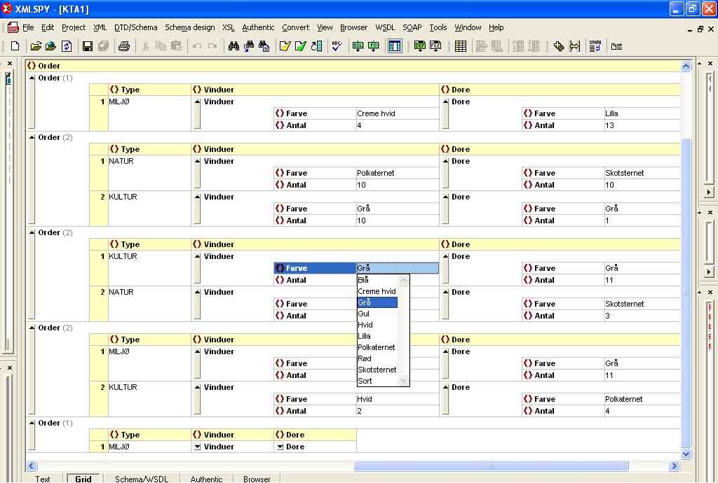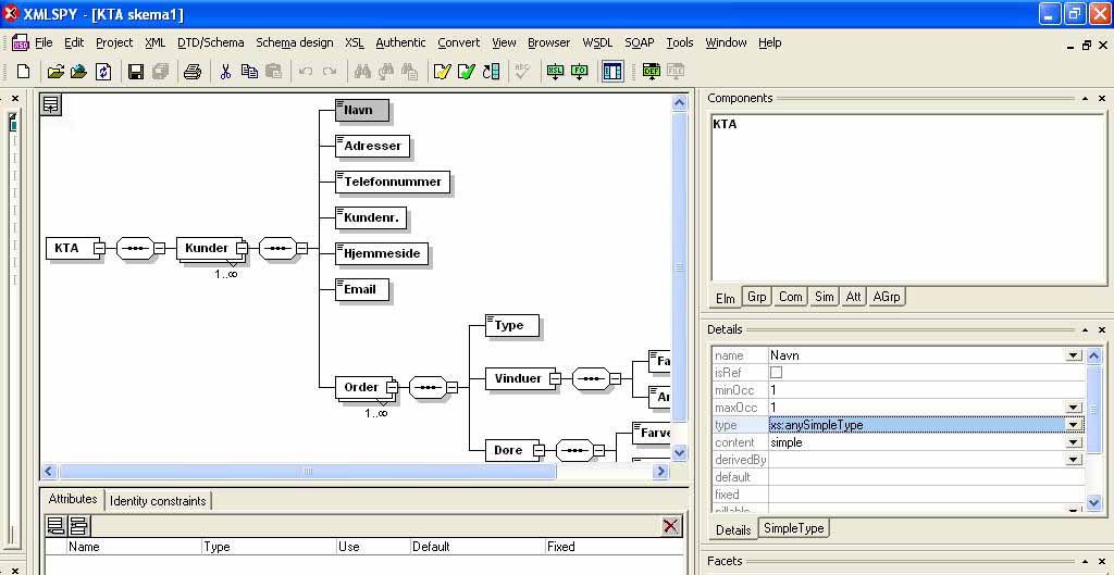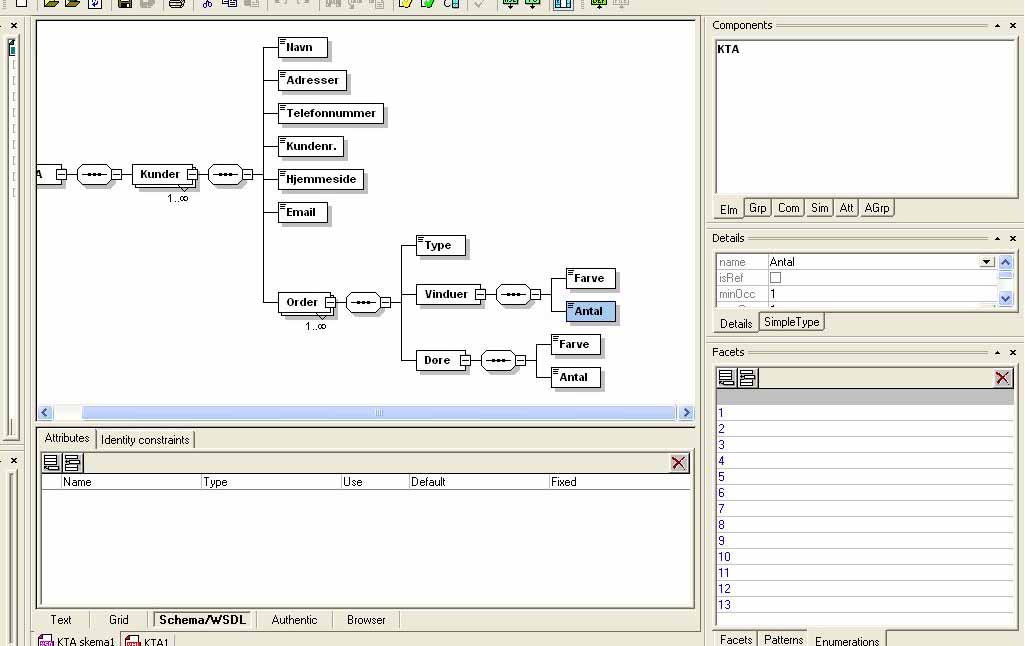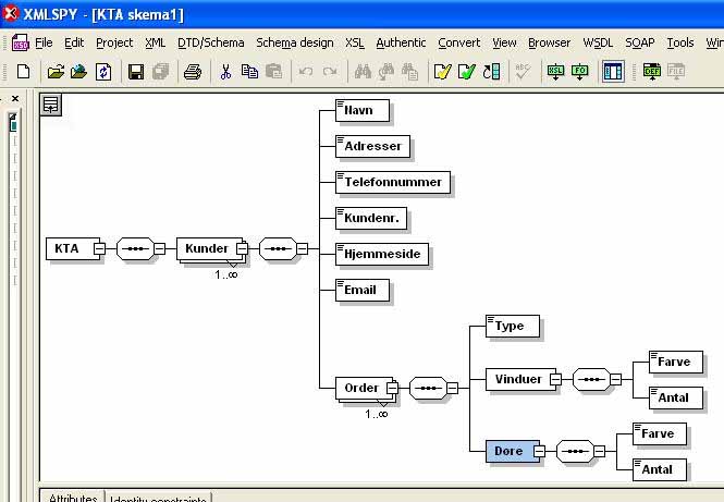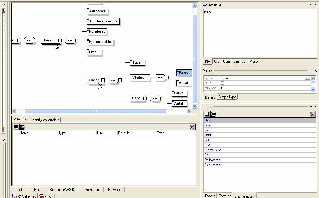 Figur 1.1 XSD opbygning. Det er lavet så der er en "en til mange" relation ved kunder og ved ordre. Dette betyder at KTA kan have flere kunder og at kunderne kan have flere ordre. Ordrene er opbygget af en type, et antal vinduer i en farve og et antal døre i en farve. Alle punkterne skal have defineret en type dette er vist i figur 1.2. Det er valgt at typerne skal være "anysimpeltype".
