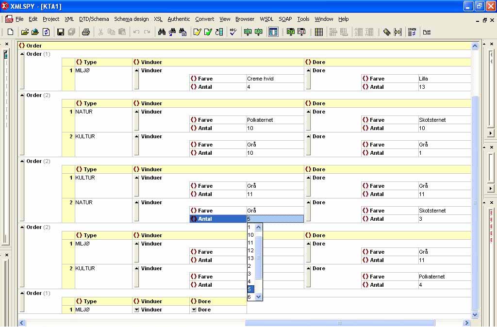 Figur 1.10 Antallene vælges. Herefter er XML dokumentet lavet. 1.2. Stylesheet DesignerI programmet Stylesheet Designer åbnes en XSD filen jf. figur 1.11. Herefter vælges "assign working XML file" som er den XML fil dataene hentes fra. Når denne er valgt udvælges hvilke elementer der skal vises og hvordan det skal præsenteres. Dette gemmes som XSL som er transformationsfilen.
