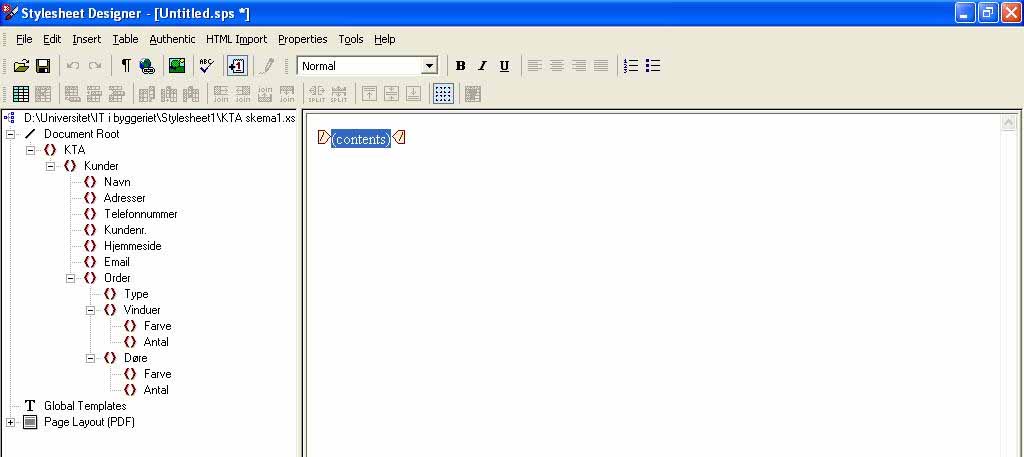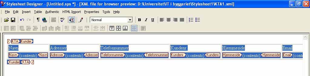 Figur 1.11 Stylesheetet designes. Det er valgt at vise alle de kunderelaterede elementer. Dette gøres ved at trække "kunder" hen til "contents" og vælge at det skal vises som en tabel. Designopsætningen er vist i figur 1.12.