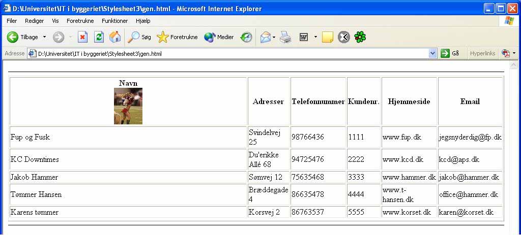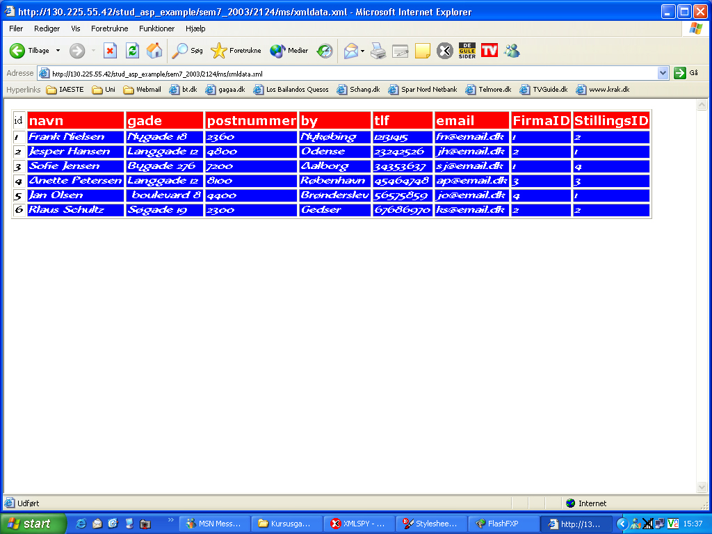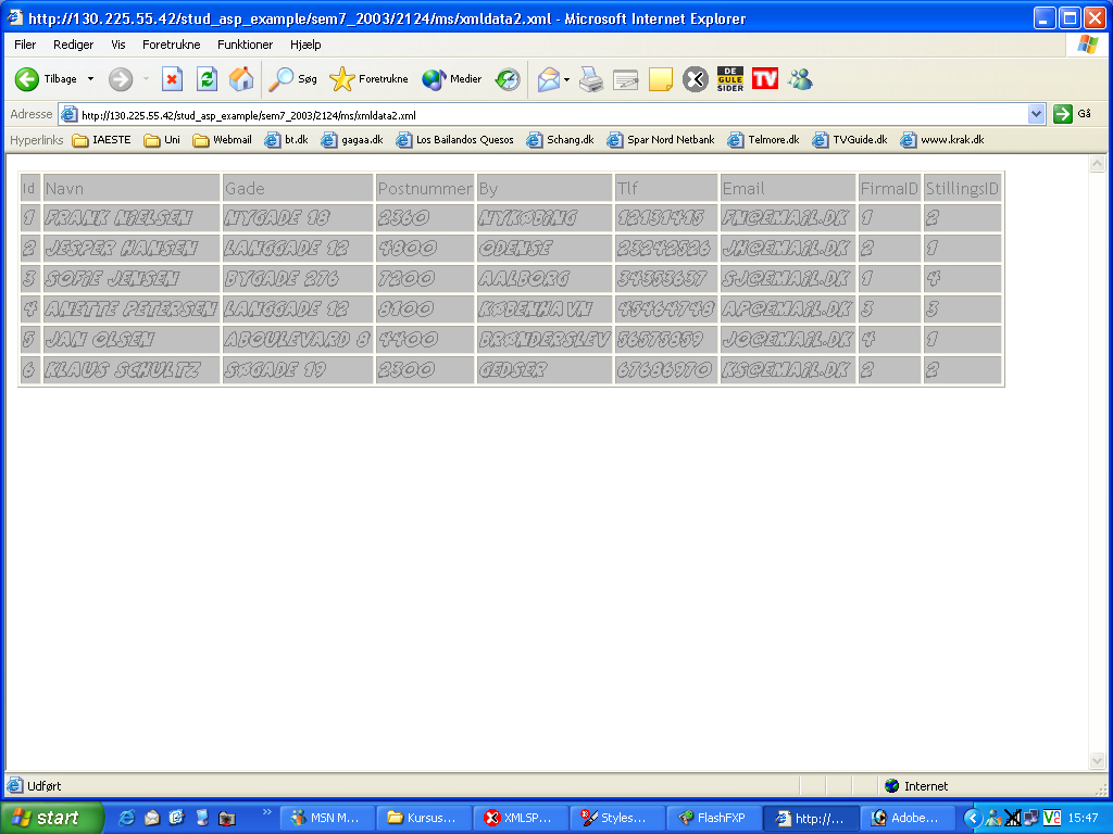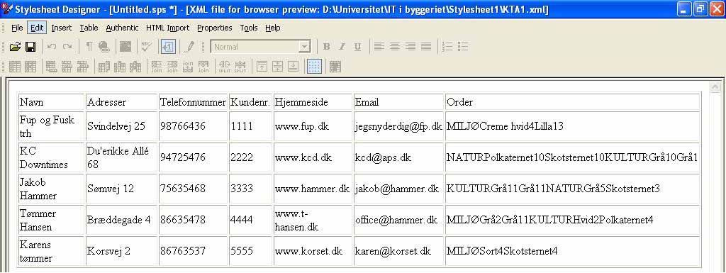 Figur 1.14 Dataene præsenteres i htmlformat. For at kunne opdatere XSL layoutet skal der i XMLSPY vælges "assign XSL" under XSL i menubaren. Det er fundet at programmerne ikke opdatere med det sammen, men først når der er skiftet mellem forskellige skærmbilleder. GROUP 2.124Det smarte ved at anvende XML er at man kan oversætte data fra et system til et andet uden en større konverteringsproces. Dataene forbliver i sin oprindelige form dvs. Ligesom: