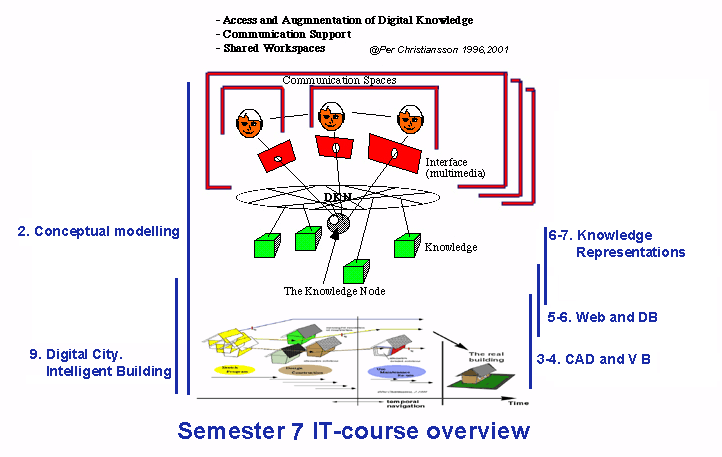 Since the introduction of the world wide web (WWW) and standardisation of Internet services and communication protocols we can see a huge shift in the way we communicate, collaborate and handle digital knowledge. The semester 7 course focuses on models and representations of building products and processes. (In the semester 8 course we take an end user perspective on how ICT tools can support collaboration, communication and access to Internet based computer resources.)