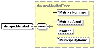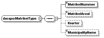 | source | <xs:complexType name="MatrikelType"> <xs:sequence> <xs:element name="MatrikelNummer" type="kms:LandParcelNoteTextType"/> <xs:element name="MatrikelAreal" type="kms:LandParcelAreaType" minOccurs="0"/> <xs:element name="Kvarter" minOccurs="0"/> <xs:element name="MunicipalityName" type="cpr:MunicipalityNameType" minOccurs="0"/> </xs:sequence> </xs:complexType> |