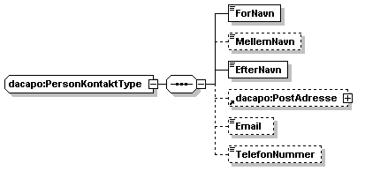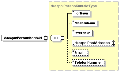 | source | <xs:complexType name="PersonKontaktType"> <xs:sequence> <xs:element name="ForNavn" type="dkcc:PersonGivenNameType"/> <xs:element name="MellemNavn" type="dkcc:PersonMiddleNameType" minOccurs="0"/> <xs:element name="EfterNavn" type="dkcc:PersonSurnameNameType"/> <xs:element ref="dacapo:PostAdresse" minOccurs="0"/> <xs:element name="Email" type="xkom:EmailAddressIdentifierType" minOccurs="0"/> <xs:element name="TelefonNummer" type="dacapo:Telefonnummer" minOccurs="0"/> </xs:sequence> </xs:complexType> |