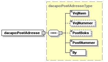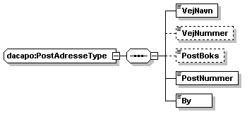 | source | <xs:complexType name="PostAdresseType"> <xs:sequence> <xs:element name="VejNavn" type="dkcc:StreetName"/> <xs:element name="VejNummer" type="dkcc:StreetBuildingIdentifierType" minOccurs="0"/> <xs:element name="PostBoks" type="dkcc:PostOfficeBoxIdentifierType" minOccurs="0"/> <xs:element name="PostNummer" type="dkcc:PostCodeIdentifierType"/> <xs:element name="By" type="dkcc:DistrictNameType"/> </xs:sequence> </xs:complexType> |