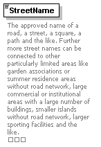 | source | <xs:element name="StreetName" type="dkcc:StreetName"> <xs:annotation> <xs:documentation>The approved name of a road, a street, a square, a path and the like. Further more street names can be connected to other particularly limited areas like garden associations or summer residence areas without road network, large commercial or institutional areas with a large number of buildings, smaller islands without road network, larger sporting facilities and the like. </xs:documentation> </xs:annotation> </xs:element> |