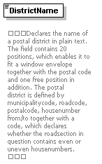 | source | <xs:element name="DistrictName" type="dkcc:DistrictNameType"> <xs:annotation> <xs:documentation> Declares the name of a postal district in plain text. The field contains 20 positions, which enables it to fit a window envelope together with the postal code and one free position in addition. The postal district is defined by municipalitycode, roadcode, postalcode, housenumber from/to together with a code, which declares whether the roadsection in question contains even or uneven housenumbers. </xs:documentation> </xs:annotation> </xs:element> |