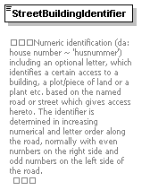 | source | <xs:element name="StreetBuildingIdentifier" type="dkcc:StreetBuildingIdentifierType"> <xs:annotation> <xs:documentation> Numeric identification (da: house number ~ 'husnummer') including an optional letter, which identifies a certain access to a building, a plot/piece of land or a plant etc. based on the named road or street which gives access hereto. The identifier is determined in increasing numerical and letter order along the road, normally with even numbers on the right side and odd numbers on the left side of the road. </xs:documentation> </xs:annotation> </xs:element> |