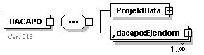 | source | <xs:element name="DACAPO"> <xs:annotation> <xs:documentation>Ver. 015</xs:documentation> </xs:annotation> <xs:complexType> <xs:sequence> <xs:element name="ProjektData"> <xs:complexType> <xs:sequence> <xs:element ref="dacapo:FirmaKontakt"/> <xs:element name="OprettetDato"> <xs:simpleType> <xs:restriction base="xs:date"/> </xs:simpleType> </xs:element> <xs:element name="ProjektInfo" type="xs:string"/> </xs:sequence> </xs:complexType> </xs:element> <xs:element ref="dacapo:Ejendom" maxOccurs="unbounded"/> </xs:sequence> </xs:complexType> </xs:element> |