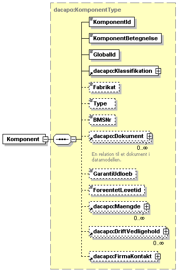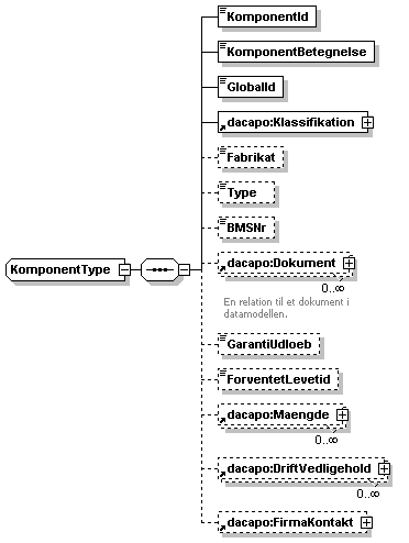 | children | KomponentId KomponentBetegnelse GlobalId dacapo:Klassifikation Fabrikat Type BMSNr dacapo:Dokument GarantiUdloeb ForventetLevetid dacapo:Maengde dacapo:DriftVedligehold dacapo:FirmaKontakt | ||
