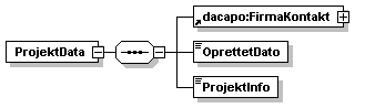 | source | <xs:element name="ProjektData"> <xs:complexType> <xs:sequence> <xs:element ref="dacapo:FirmaKontakt"/> <xs:element name="OprettetDato"> <xs:simpleType> <xs:restriction base="xs:date"/> </xs:simpleType> </xs:element> <xs:element name="ProjektInfo" type="xs:string"/> </xs:sequence> </xs:complexType> </xs:element> |