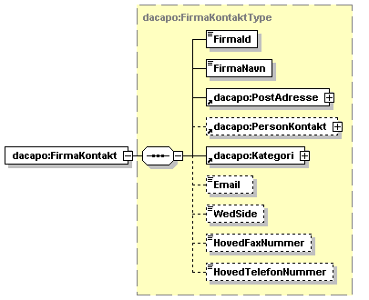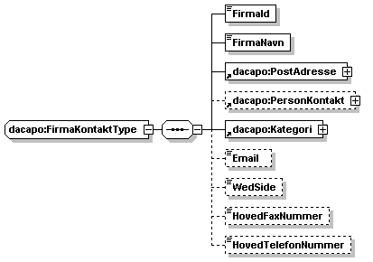 | source | <xs:complexType name="FirmaKontaktType"> <xs:sequence> <xs:element name="FirmaId" type="xs:string"/> <xs:element name="FirmaNavn" type="dkcc:OrganisationNameType"/> <xs:element ref="dacapo:PostAdresse"/> <xs:element ref="dacapo:PersonKontakt" minOccurs="0"/> <xs:element ref="dacapo:Kategori"/> <xs:element name="Email" type="xkom:EmailAddressIdentifierType" minOccurs="0"/> <xs:element name="WedSide" type="xs:anyURI" minOccurs="0"/> <xs:element name="HovedFaxNummer" type="dacapo:Telefonnummer" minOccurs="0"/> <xs:element name="HovedTelefonNummer" type="dacapo:Telefonnummer" minOccurs="0"/> </xs:sequence> </xs:complexType> |