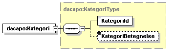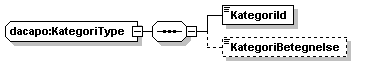 | source | <xs:complexType name="KategoriType"> <xs:sequence> <xs:element name="KategoriId"> <xs:simpleType> <xs:restriction base="xs:string"> <xs:maxLength value="10"/> </xs:restriction> </xs:simpleType> </xs:element> <xs:element name="KategoriBetegnelse" type="dacapo:Betegnelse" minOccurs="0"/> </xs:sequence> </xs:complexType> |