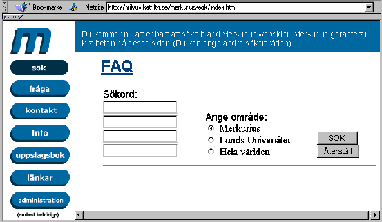 A structural engineer is searching for information and possibly knowledgeable persons in the area of structural loadbearing capacity. He especially looks for high temperature steel properties in connection with repair of fire loaded paint protected beams. He contacts the Merkurius URL (Uniform Resource Locator) on the Internet. Merkurius, see figure 1, is a communication and information resource (demonstrator under development) through which knowledge produced at the Lund University is accessible. Information can be reached in three modes (a) through indexed free text search combined with search on documents similar to a found document, (b) by use of the public project and idea capture area where he can pose questions and look for potential project participants or (c) through establishment of a personal contact with a knowledgeable person at the university. In figure 1 it can be seen how the search domain may be restricted (`ange sökområde`) to the local Merkurius knowledge container (concerning the knowledge communication process and information search itself), Lund University or the world.