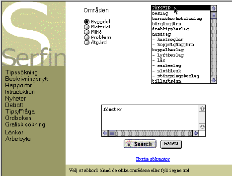 The engineer finds a reference to another URL, Serfin, via a set of keywords already used. The Serfin knowledge node, [2], is a communication and information resource for handling technical building maintenance knowledge. Figure 2 shows how he can choose between a coarse top-down search using controlled vocabularies (with optional graphic support) for five knowledge domians or plain free text search.