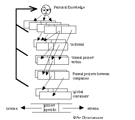 Three overlapping levels of logical information repositories can be distinguished (1) the personal user dependent, (2) the project/cultural and (3) the global community dependent, see figure 3. On each level we will find long term rather well formalized containers in the form of databases and object stores, which are viewed and handled in project/cultural context through for example Structured Query Language, SQL, and web browser interfaces. The inter project/cultural linkages can be facilitated with RDF and dynamically adapted on the user levels through use of for example XSL, Extensible Style Language, to specify web document styles.