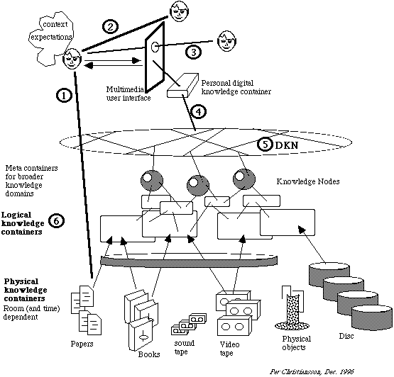 Figure 5 shows how the information access (line `1` in figure 5) to conventional physical knowledge containers as books and video tapes will change when most information is stored in digital format and packaged dynamically for different needs in non-physical (logical) containers. It is also shown how it is possible during collaboration to share information in a common workspace through multimedia interfaces (`3` in figure 5). . We talk about logical containers as contrast to physical when the physical wrapping is of importance (books, CDs, hard disks, video tapes, etc.).