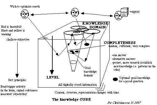 For example, a user wants to search the WWW for technical maintenance tips on removal of fire protection paint from wooden beams or frames. He will possibly be helped by an intelligent agent and start looking in metadata repositories for further links to information in the `area` of technical maintenance, `created` after 1990 in the Nordic countries. He may also do a discovery search world wide with no constraints on region or material (the right one-way upward arrow in figure 6 pointing to a new domain). After thus having narrowed in a potential goal domain he continues detailed indexed search in the `description` parts of those web-objects. These analyses may well lead to references and a jump to another unexpected knowledge domain. The search ends with a collection of supposedly sufficiently good advises.