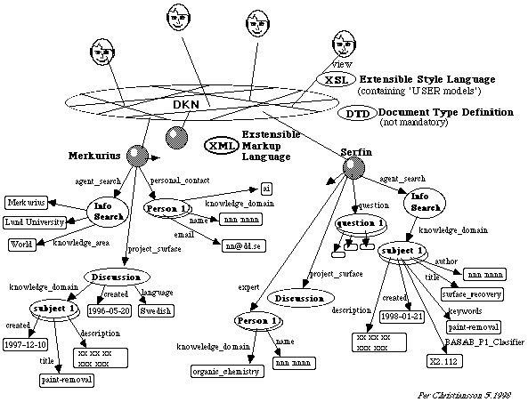 Figure 7 shows how the Knowledge Nodes Merkurius and Serfin attached to the Dynamic Knowledge Net, DKN, can be descried using directed graph notation according to the forthcoming Resource Description Framework, RDF. Such a description can be used in the conceptual modeling of the systems and later to facilitate high level couplings between the knowledge nodes. For example to discover pertinent competence persons and projects in other knowledge domains, for comparative analysis of different knowledge domains, and to harmonize application vocabulary development.