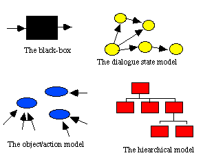 Dialogue state model passerar man olika states på väg mot mål tillståndet. Den innehåller ett antal interaktions-stadier som användaren passerar på väg mot målet. Kan bli trist att använda efter en tid men ger bättre stöd än en black-box. Exempel på state-system är bankomater.