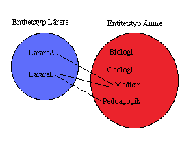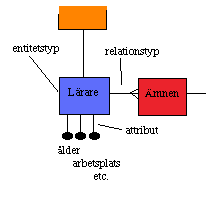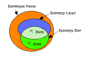 En entitet är "något vi vill ha information om inom vårt intresseområde. Det kan vara en viss person, en viss sak (ett tillstånd), ett visst ställe, en viss tilldragelse eller en viss begreppsmässig konstruktion", "En entitetstyp är en samling entiteter där alla entiterna uppfyller definitionskriterierna för entitetstypen". (Andersson, E, 1991). Entiteterna ElevA och ElevB är förekomster av entitetstypen 'Person'. Entitetstyperna 'Lärare' och 'Elev' är delmängder i entitetstypen 'Person'.