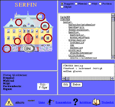 Figure 1 shows the SERFIN demonstrator phase 1 user interaction window. To the right you fill in the lower box search window with free text (FÖNSTER beslag, ...) either at your own wish or by clicking on terms in one of the five predefined classification areas; building part (according to the Swedish BSAB P2 table), material, environment, problem type, action). These terms will automatically show up in the search window as you click them.