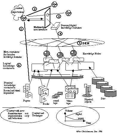 Figure 2. We will, which is already a fact, communicate and handle digitally stored knowledge in new ways. (1) user searches and finds knowledge stored on paper. (2) Persons meet in real life or (3) use simple multimedia interfaces as telephone. The multimedia interface expands to incorporate more of our senses (Computer Supported Collaborative Work - CSCW and Virtual Reality - VR, etc.). (4) Part of your personal computer stored knowledge may be connected to the Dynamic Knowledge Net - DKN.