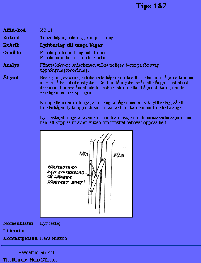 The search is performed as a free text search in an automatically indexed local tip bank. The answers are given with relevance feed-back. If no adequate answers are given a question my be posed supplied with clarifying images. It is also possible to send in own tips and experiences. Seven big maintenance companies participate in the project Vasakronan AB, Statens Fastighetsverk, Akademiska hus i Stockholm AB, Hantverks- och industribyggen i Stockholm AB, Postfastigheter, Familjebostäder and Skandia Fastighet.