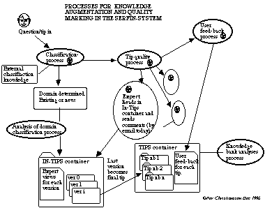 The process of receiving questions and new tips are now under its second stage of development . The process is described in figure 8. All versions of improved tips are stored together with expert comments. The expert reaches the in-tips or questions on the World Wide Web through the protected SERFIN working area. The facts/tips containers still consist of files containing HTML documents as the final data models are not yet decided on. As these condense they will be transferred to a database management system.